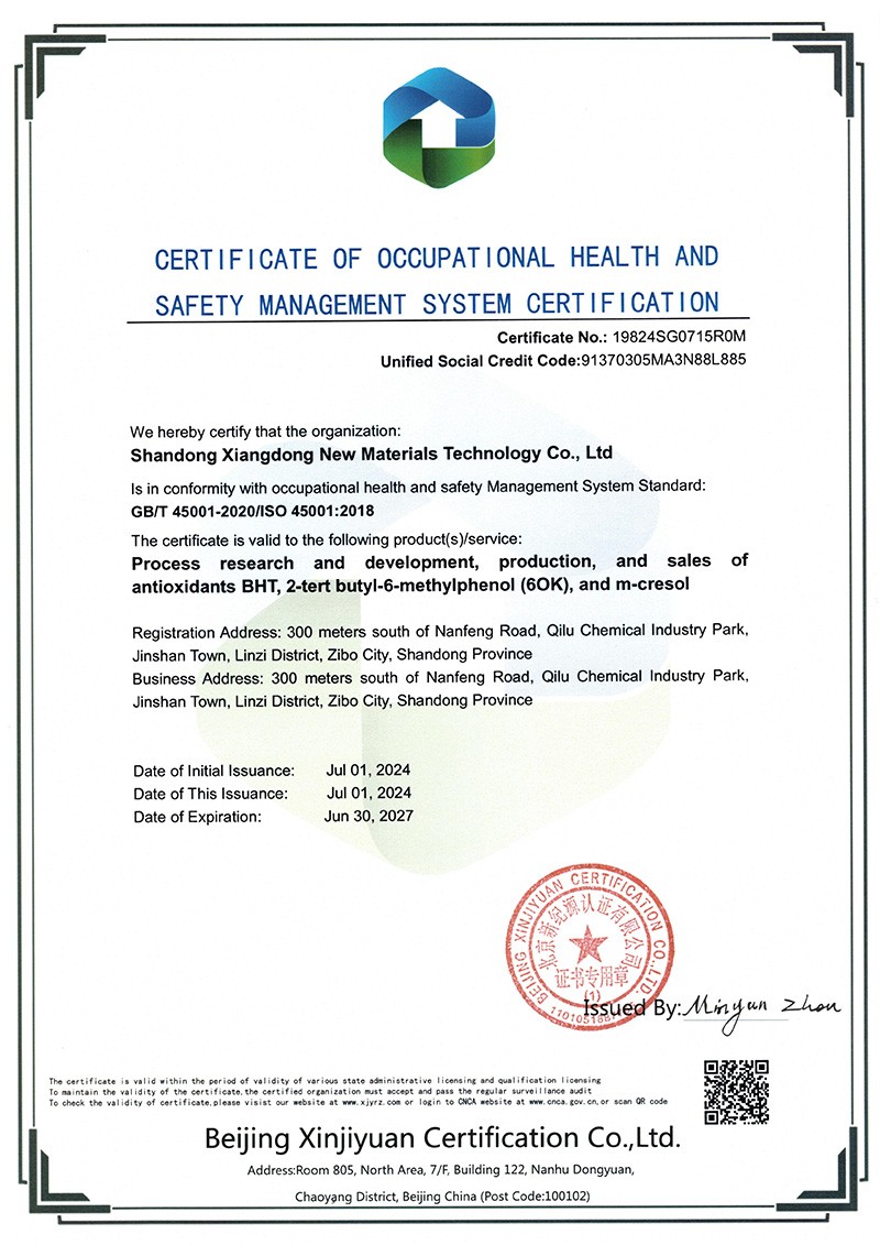 山東祥東新材料科技有限公司1.2萬噸/年6-叔丁基鄰甲(60K)、4-叔丁基鄰甲酚(偏 24 酚)和 4,6-二叔丁基鄰甲酚(偏 246 酚)烷基甲酚項目竣工環(huán)境保護驗收監(jiān)測報告